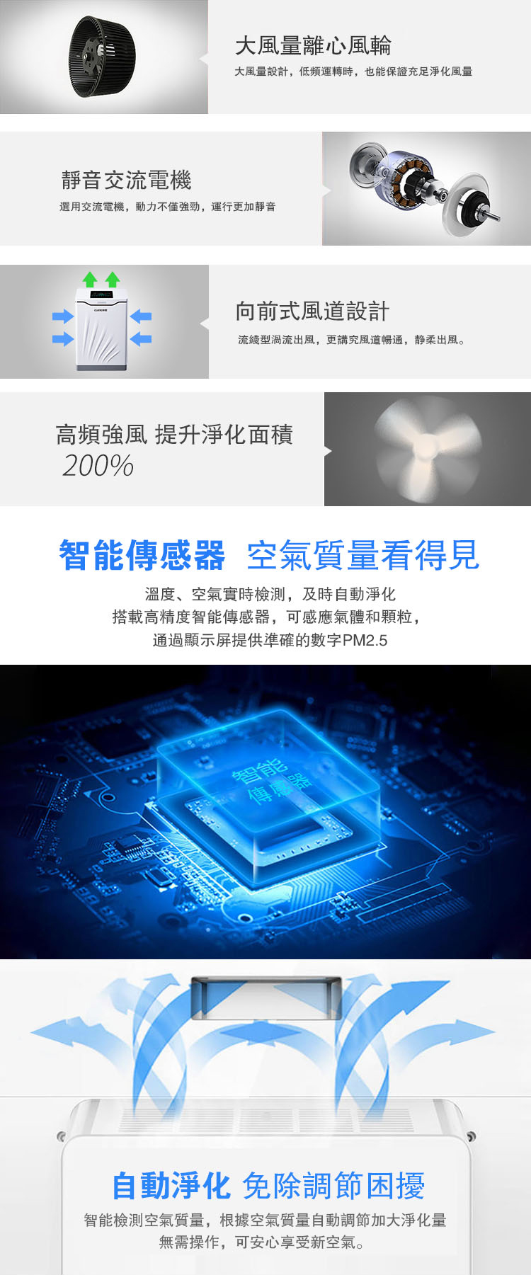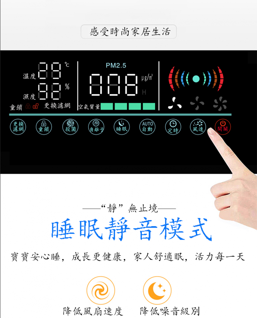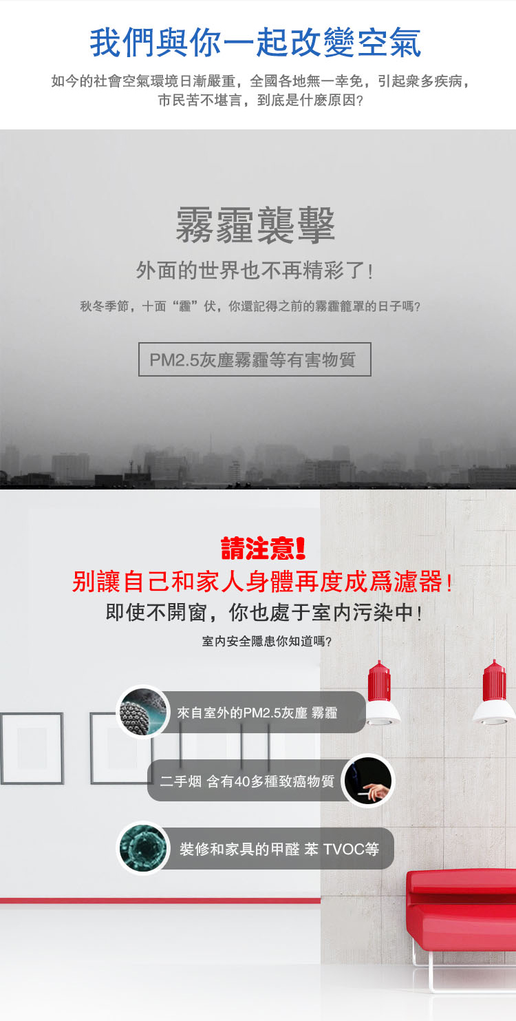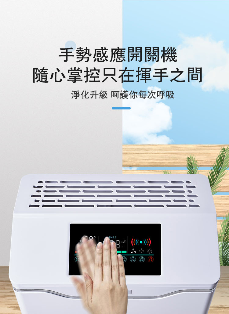 釋放負離子,消除菸塵異味,消除甲醛PM2.5,冷觸媒過濾,淨化顆粒物,手勢感應開關